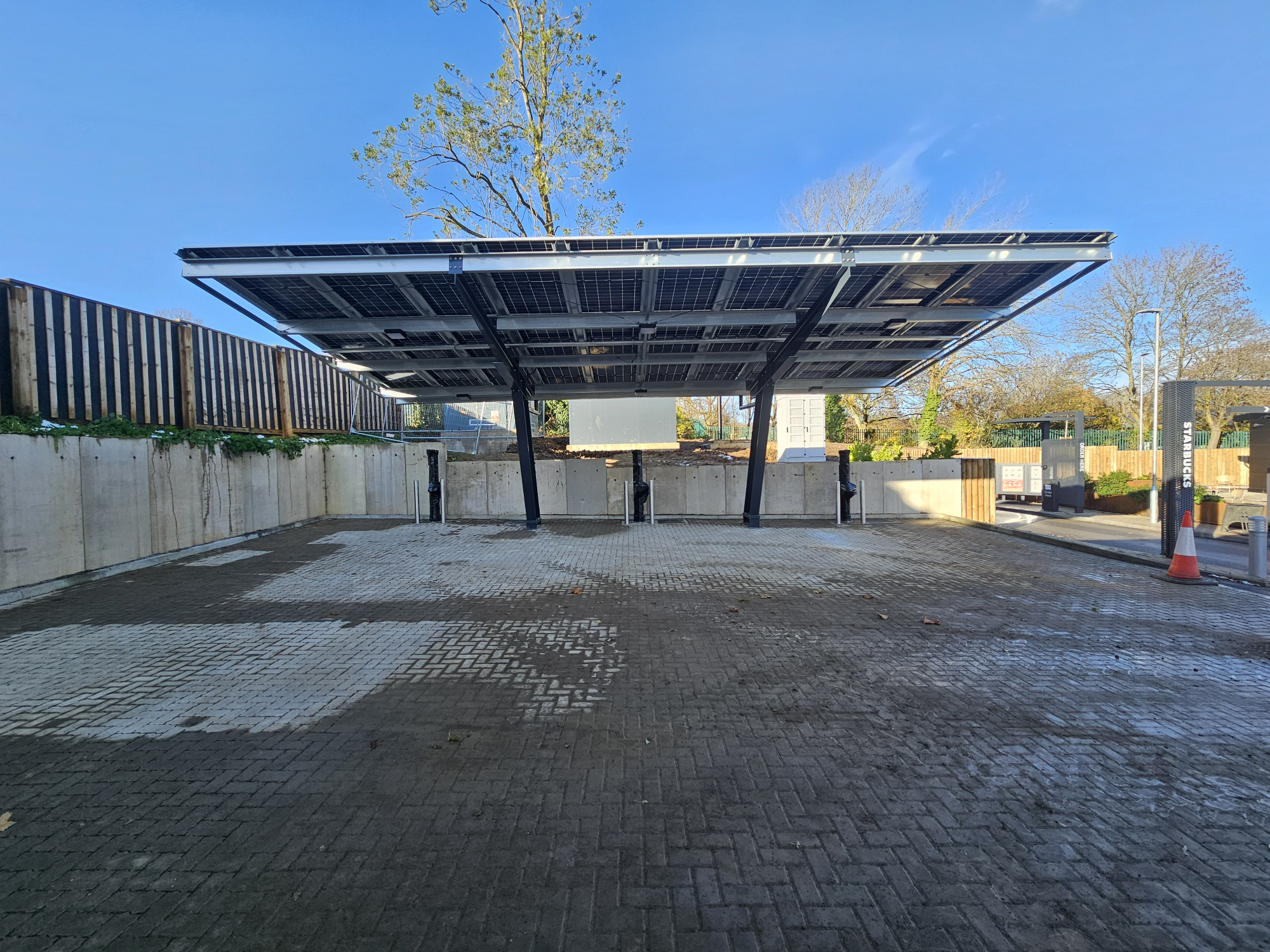TJ Atkin Ltd were appointed to construct and manage the delivery of a prototype electric vehicle charging station for a national client. The scheme incorporated integrated battery storage and solar panels, all within the site of an existing coffee shop and drive-through facility.